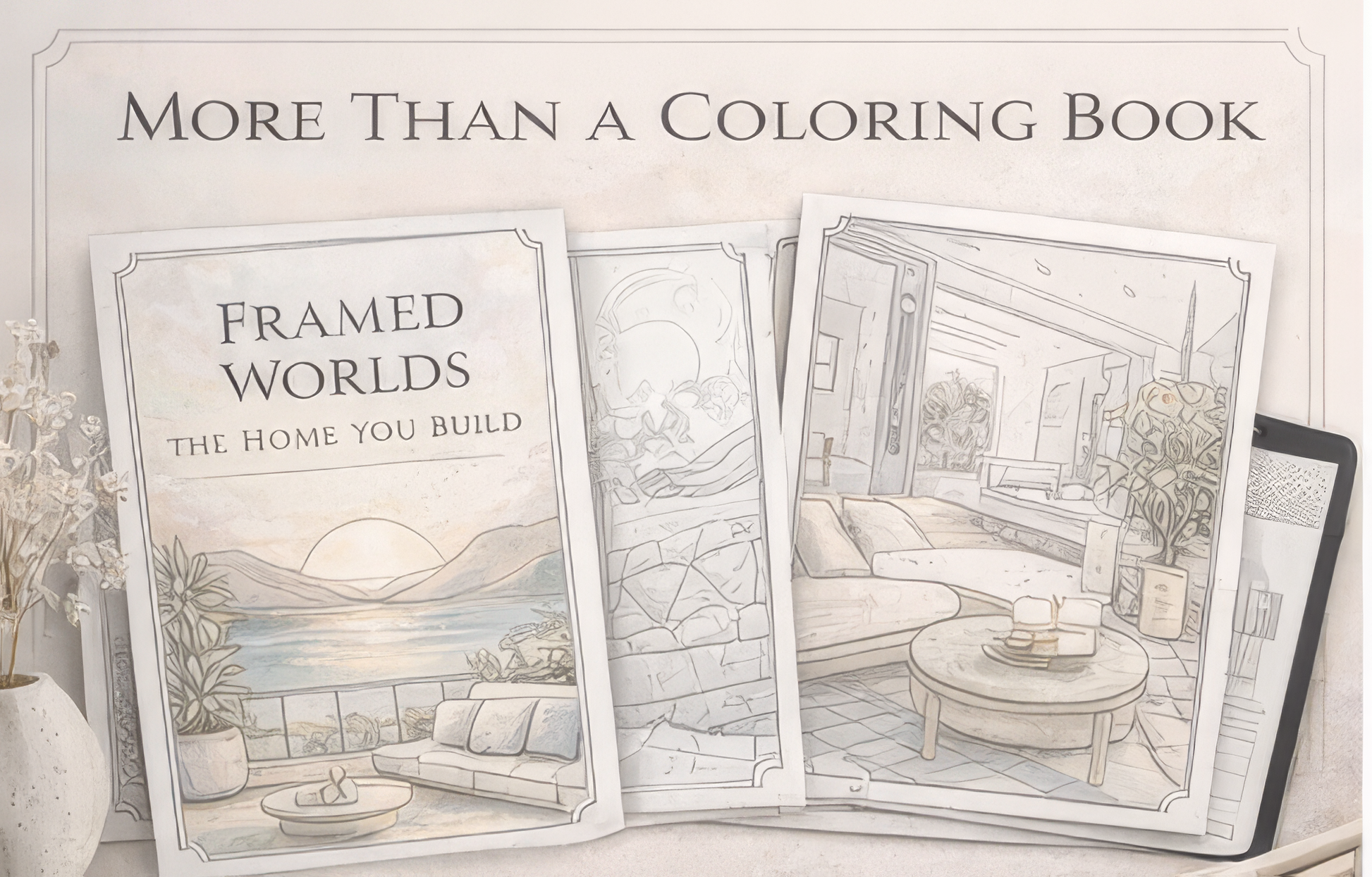 Framed Worlds: The Home You Build is not just a coloring book — it’s a guided, immersive experience in imagining the spaces you live in and the feeling you want them to hold.