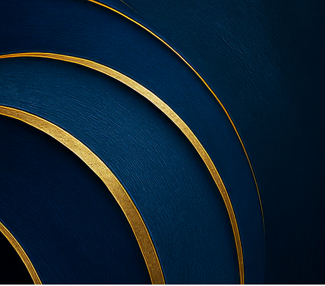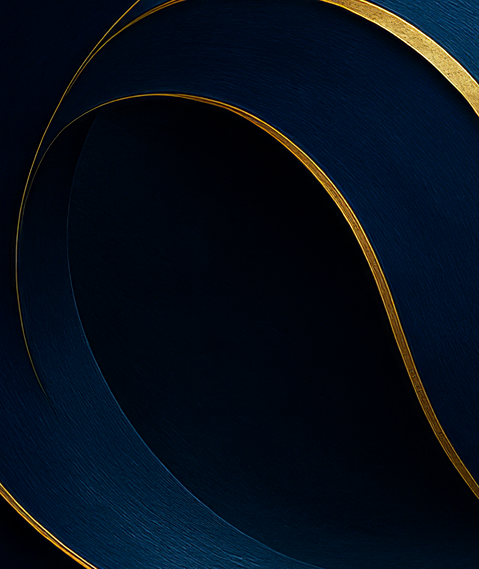 Drift & Descent is a bold, sculptural abstract art print designed for the Prestige Series. It features layered arcs in deep navy, cobalt, and charcoal, set against a blackwater-inspired background that radiates quiet tension and power. Metallic gold and silver outlines give each arc dimensional lift, as if floating above shifting currents. Subtle motion blur and reflective contrast elevate this piece from static design to cinematic depth.