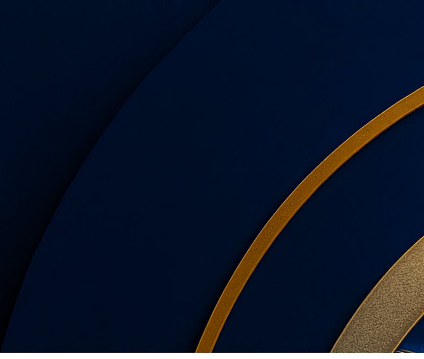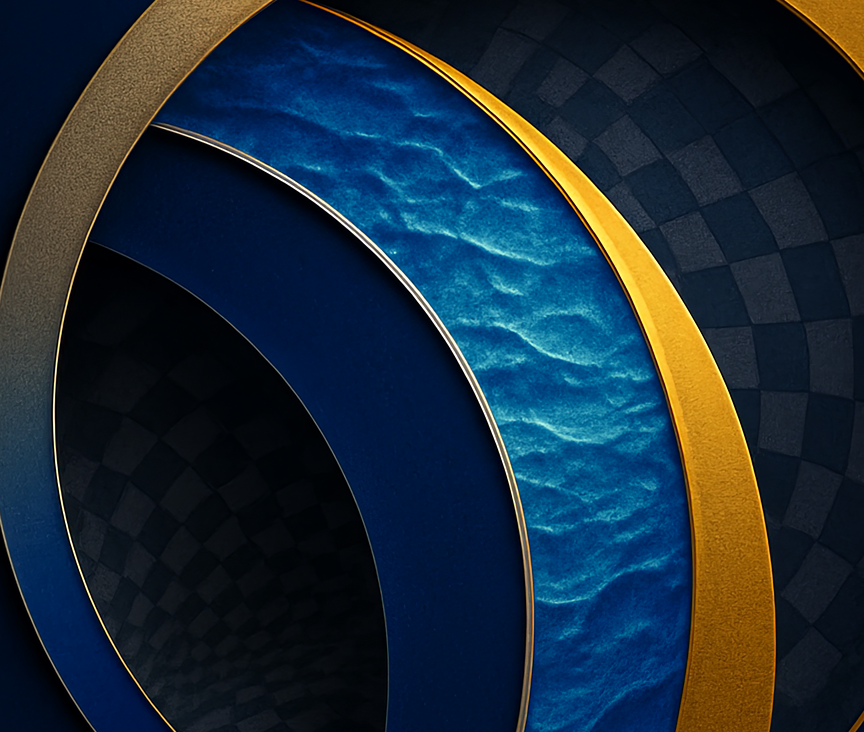 Ebb & Edge is a sophisticated abstract art print from the Prestige Series, featuring sweeping arcs in rich shades of navy, royal, and icy blue. Metallic gold and silver accents trace the arcs with precision, creating the illusion of movement and balance. A rippling water element at the base gives the artwork its meditative, immersive quality—like a sculpture suspended in stillness.