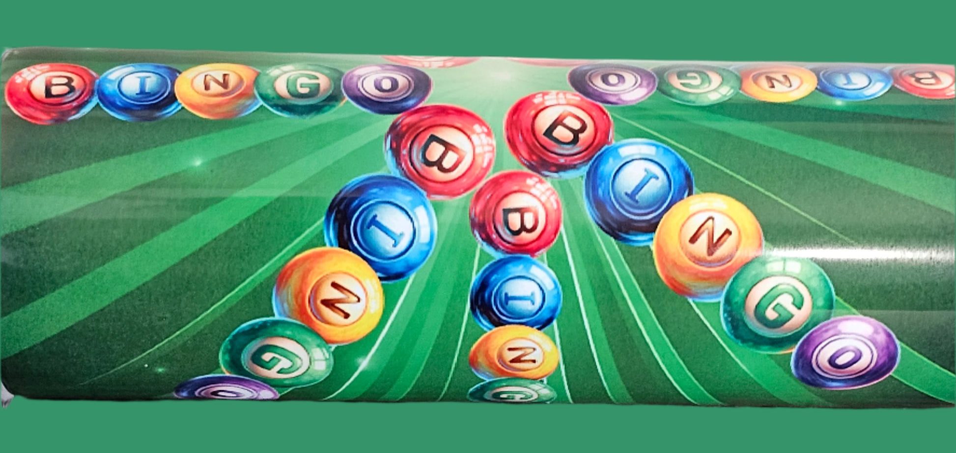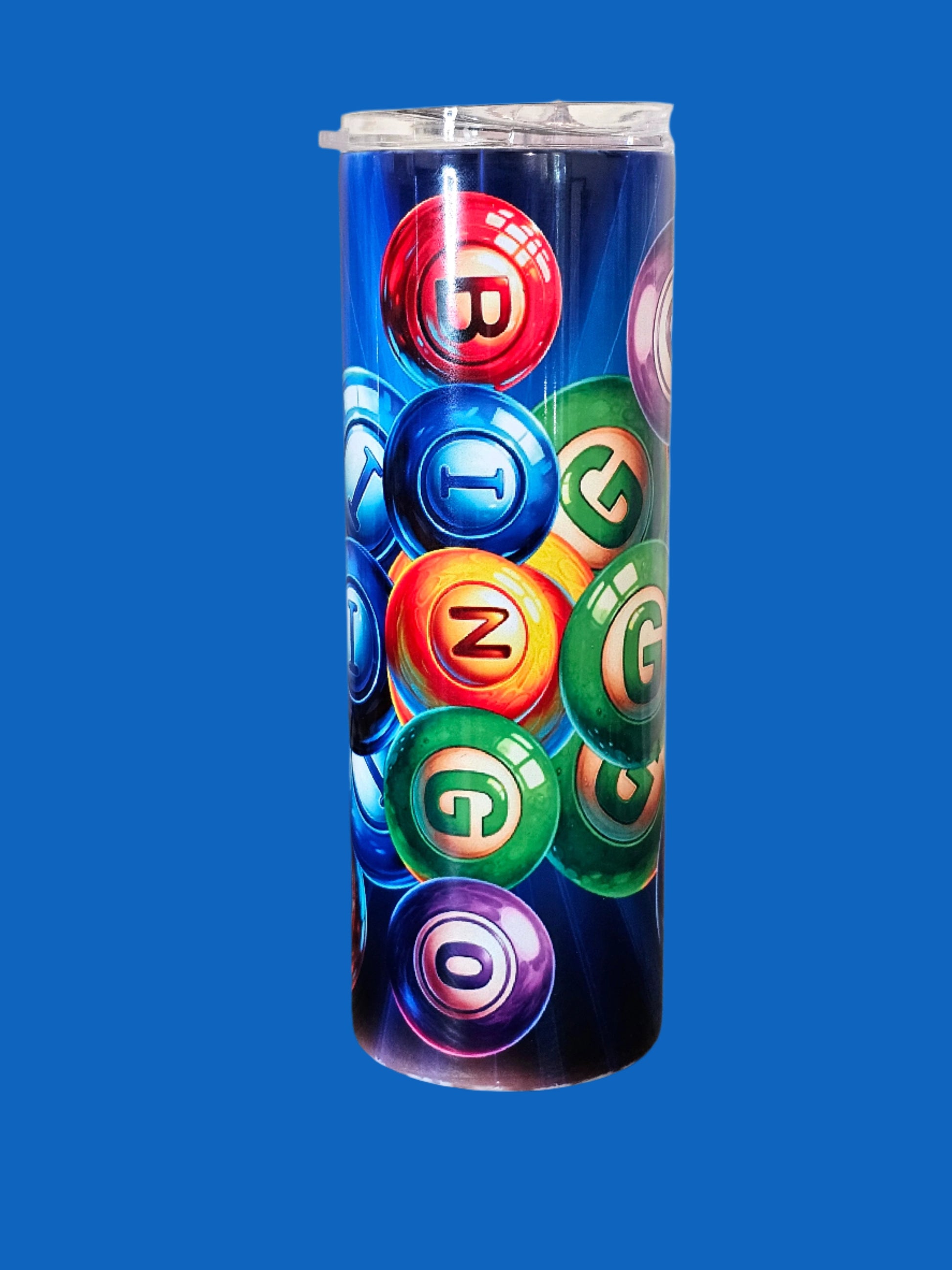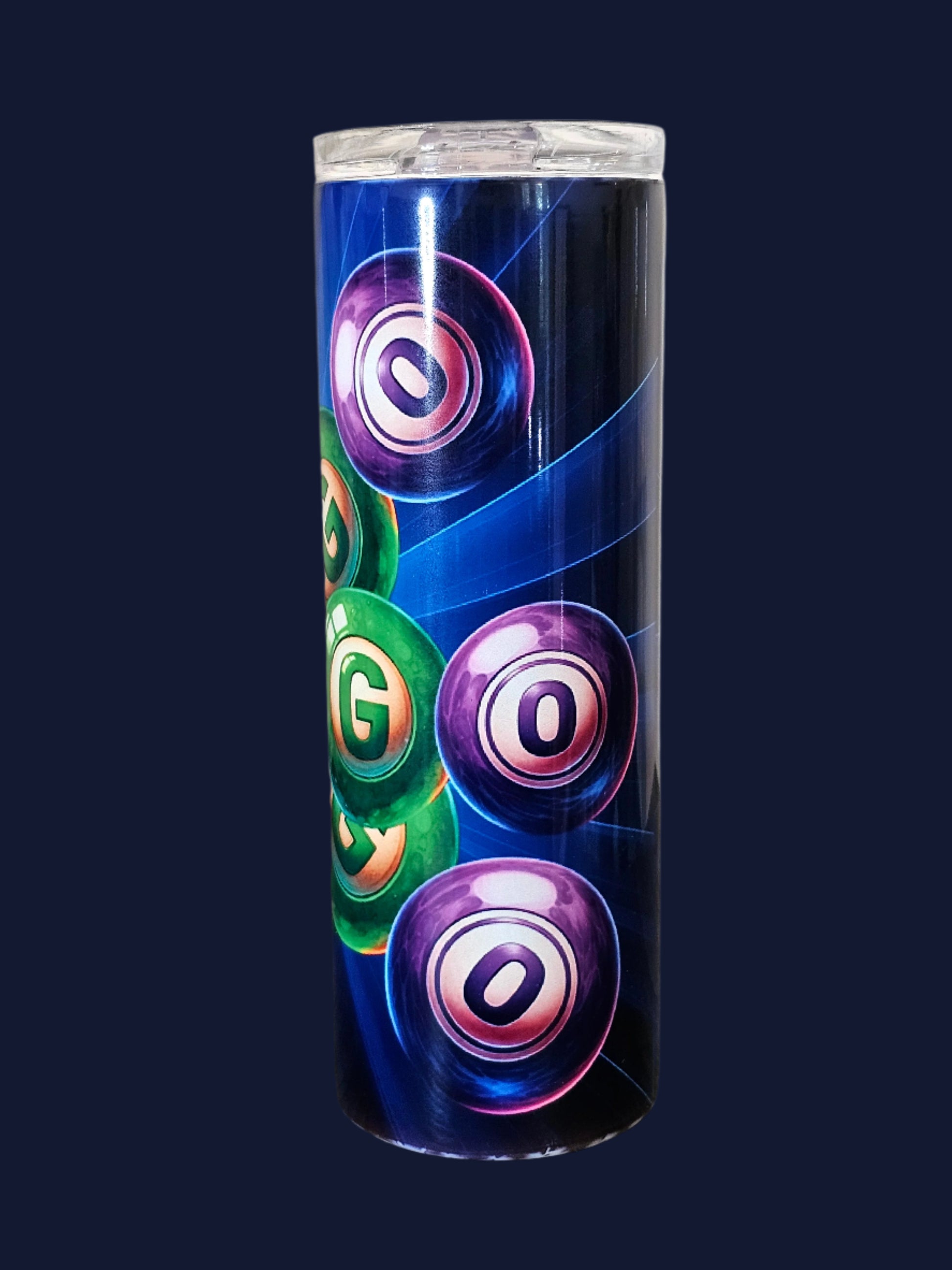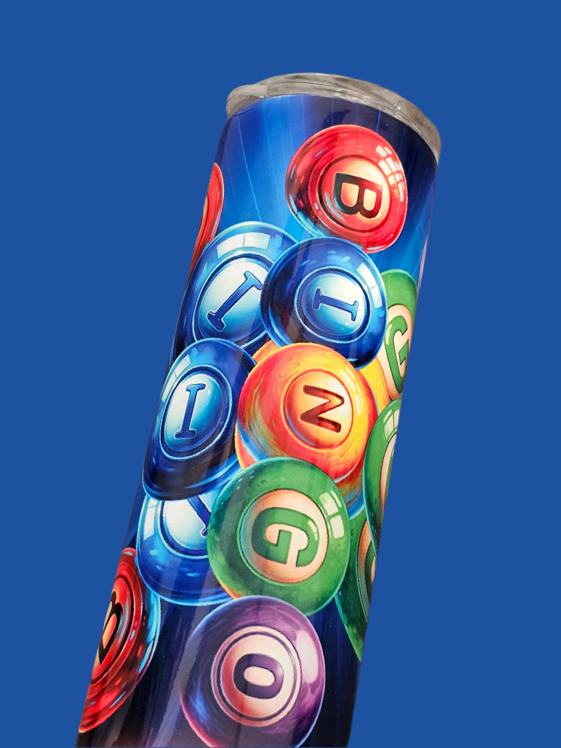 Feel the thrill of the win with this cool-toned Bingo Blue tumbler. With glossy blues and lucky B-I-N-G-O balls flying across a burst of bold color, this tumbler adds high energy to every sip.